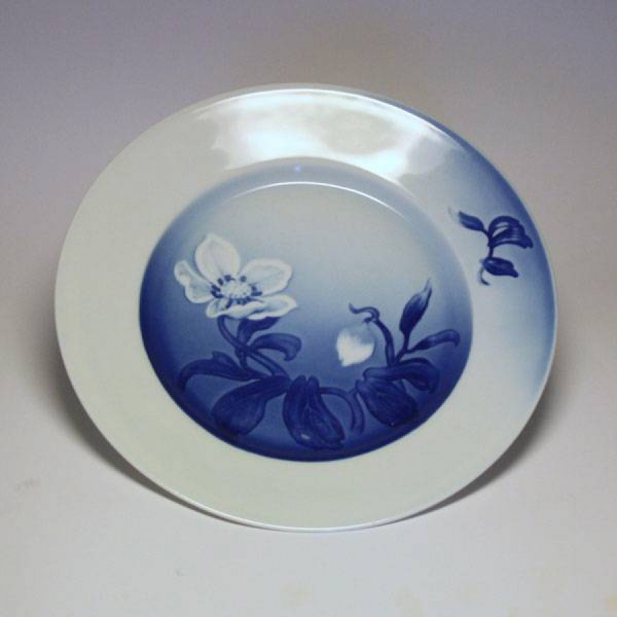 Tallerken har blå som bundfarvehvad motivet angår så er blomsterne er malet hvide og selve planten malet mørkeblå.